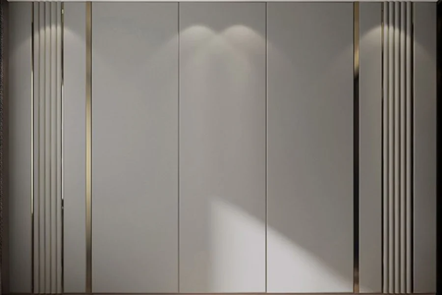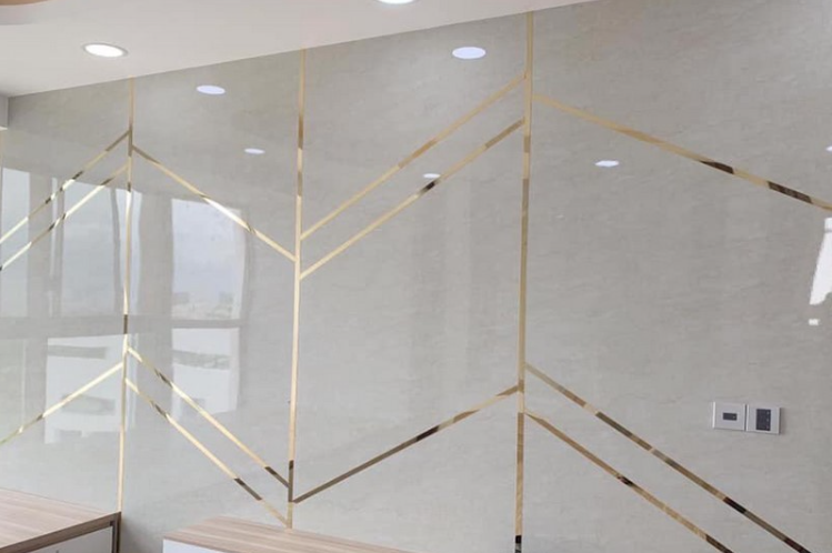 Tấm ốp vân gỗ óc chó + Nẹp inox vàng gương/vàng xước: Sự kết hợp kinh điển, mang lại cảm giác ấm cúng, sang trọng và quyền quý.